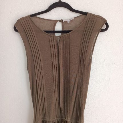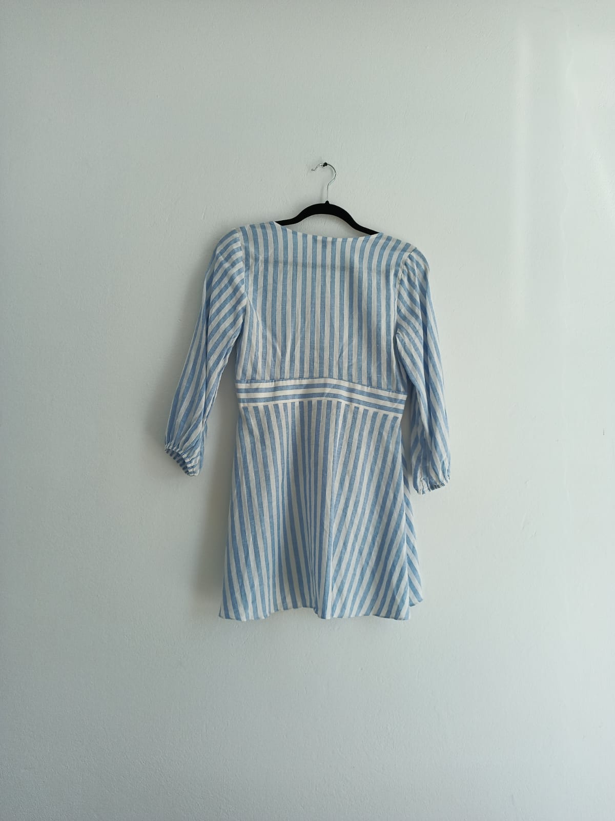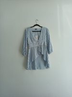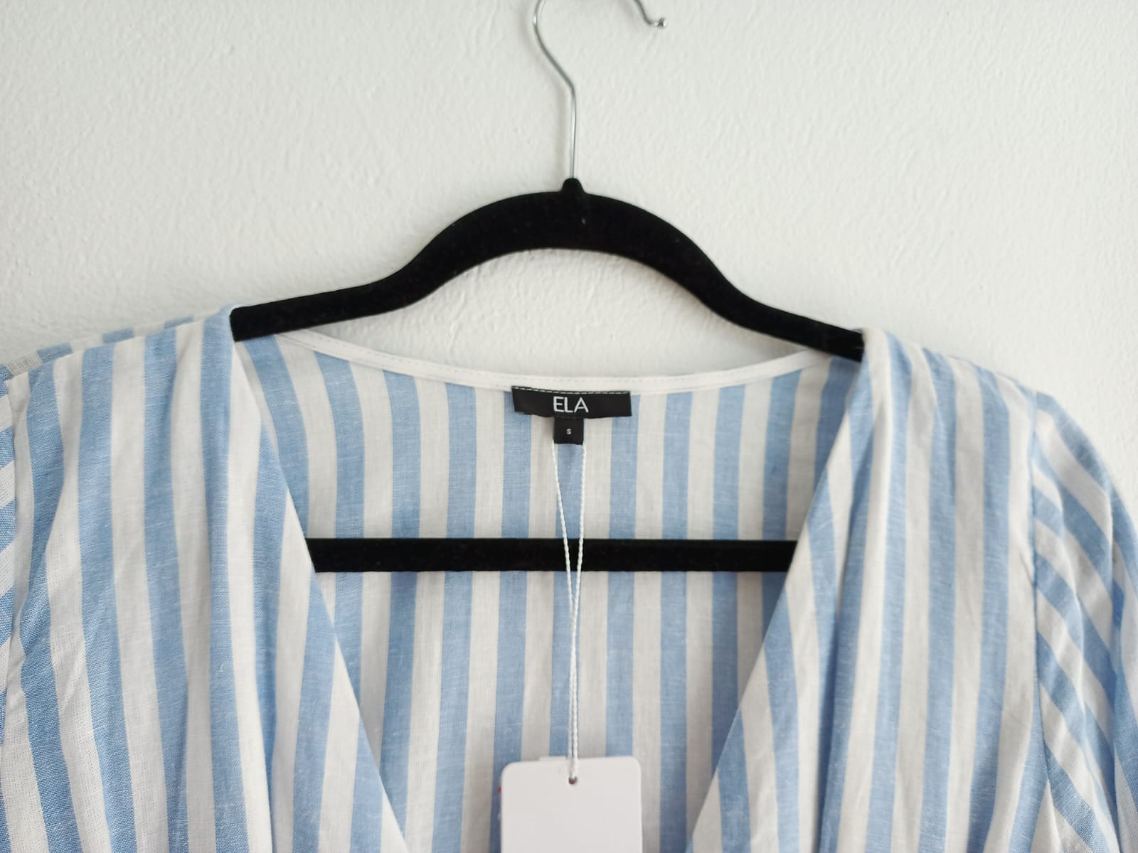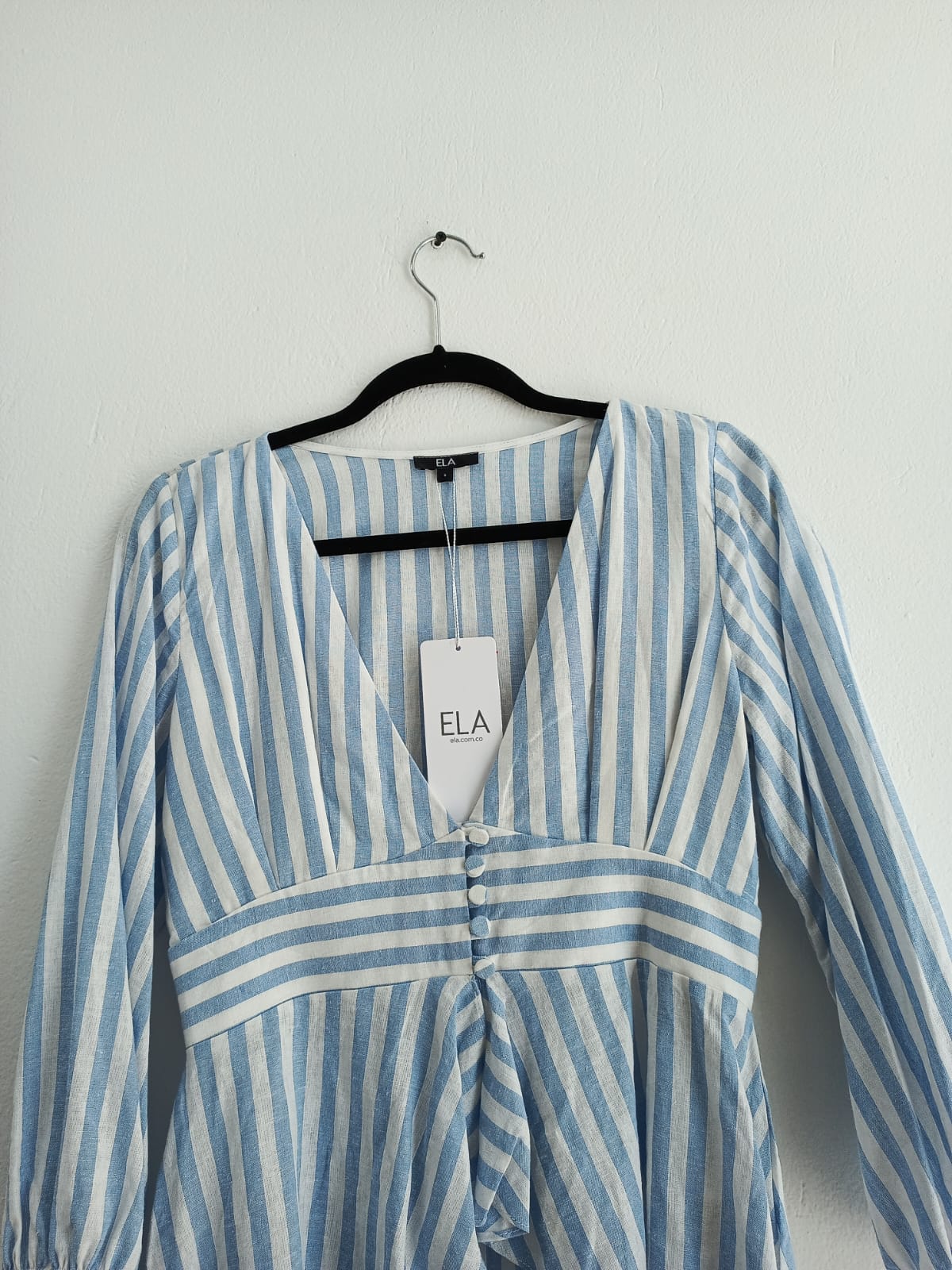Blusa sin estrenar, ajustada en la parte superior con escote profundo y mangas encauchadas en el borde, es color Azul Bebe y con rayas blancas; el largo de la blusa por la parte de atrás es de 86 cm