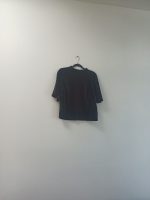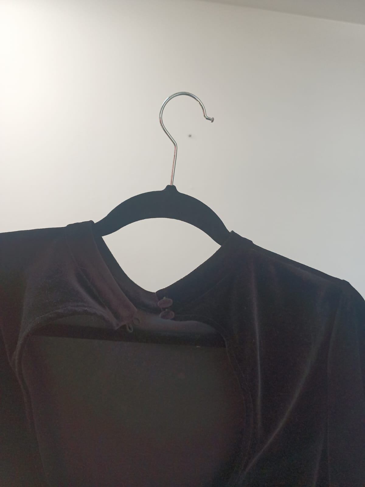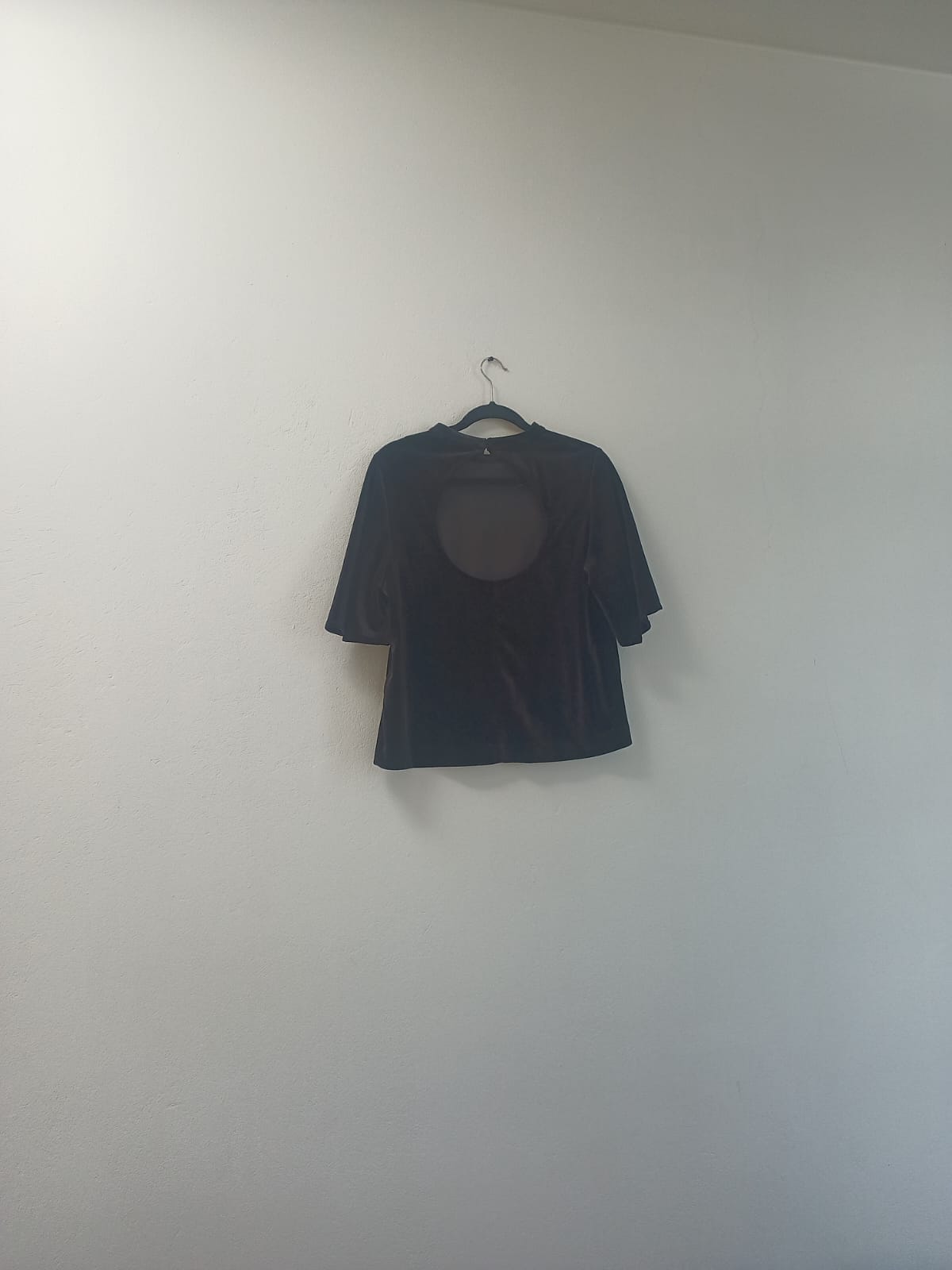 Camisa negra en terciopelo, suelta a con abertura circular en la espalda con dos botones.